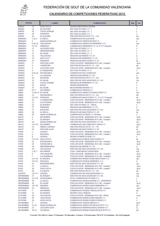 Calendario Oficial de Competiciones de la Federación de Golf de la Comunidad Valenciana correspondiente a la temporada 2013.